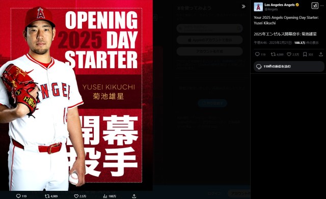 エンゼルスは「Your 2025 Angels Opening Day Starter: Yusei Kikuchi 2025年エンゼルス開幕投手: 菊池雄星」と英語と日本語で投稿しビジュアルを公開。ビジュアルには、菊池雄星が赤グローブを肩にあて、決意に満ちた表情で写っており、背景には漢字で大きく「開幕投手」書かれている。