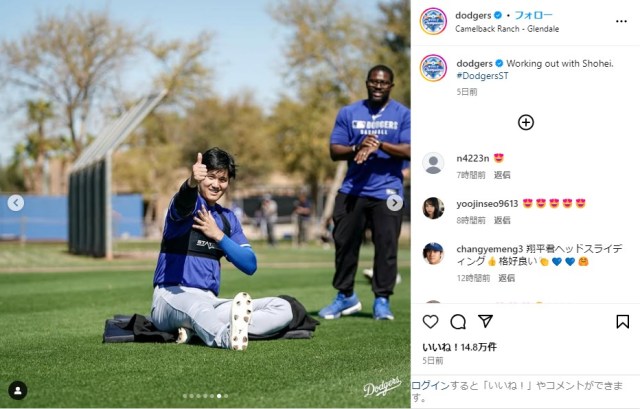 この投稿には、Instagramユーザーから「やっぱ、大谷選手は野球をしている時が一番カッコいい」「今年も楽しみ」「素敵な笑顔 順調に調整が進んでるんですね!」といったコメントが寄せられている。