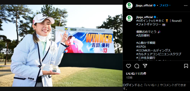JLPGAが「優勝おめでとう」というコメントと共に投稿した写真は、優勝トロフィーを手にした吉田の歓喜の様子を収めたもの。吉田は、グリーンのウェアにライトブルーのジャケットを着用する爽やかな装いだ。