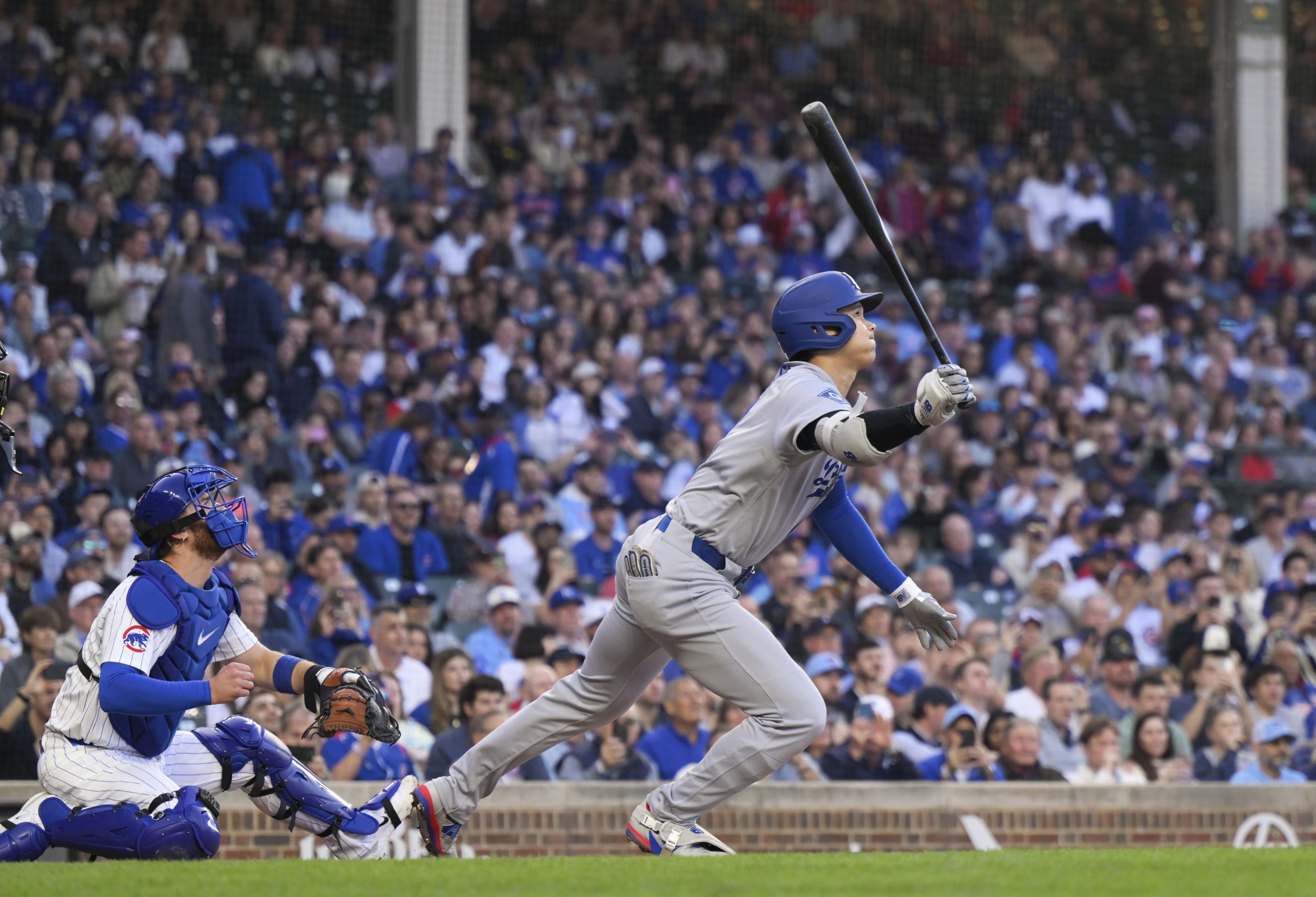 カブス戦の3回、右前打を放つドジャース・大谷=シカゴ(共同)