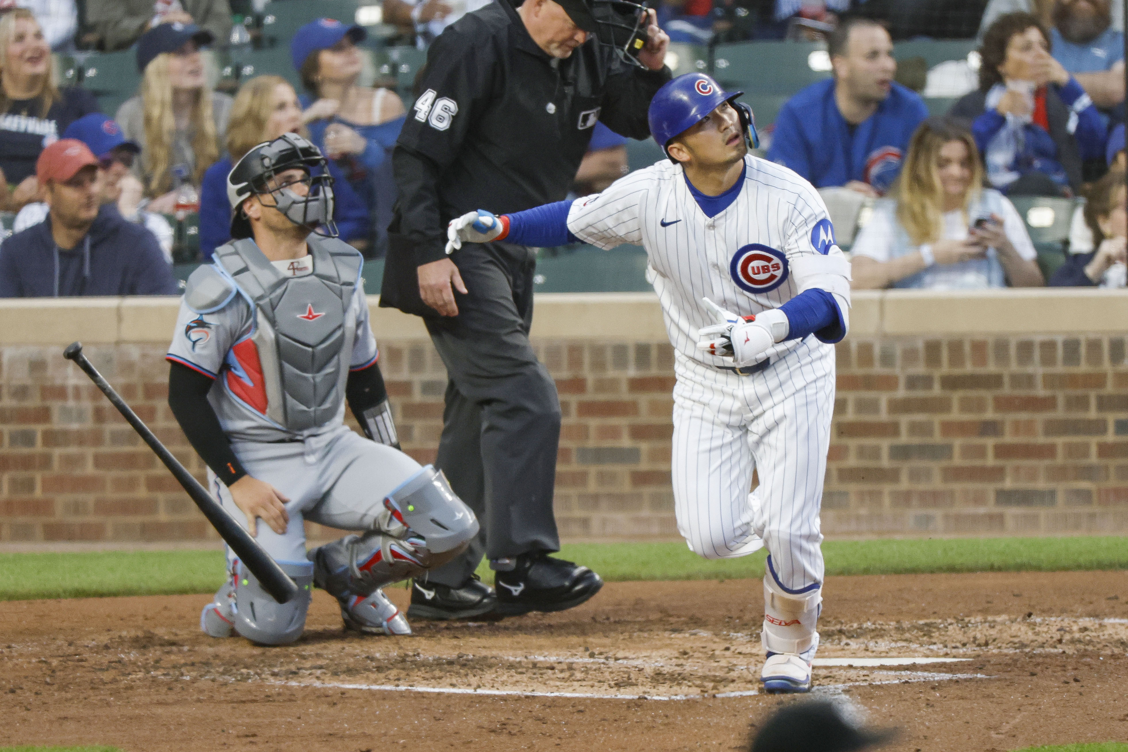 マーリンズ戦の4回、本塁打を放つカブス・鈴木=シカゴ(共同)