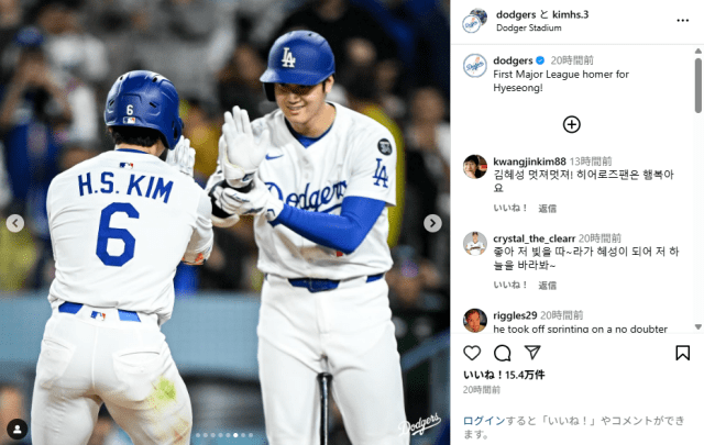 このポーズは、韓国で「リスペクト」の意味が込められているもので、大谷の粋なセレブレーションにキムも同じポーズで応えている。ドジャースは「First Major League homer for Hyeseong!」とキムの初の快挙を称えた。