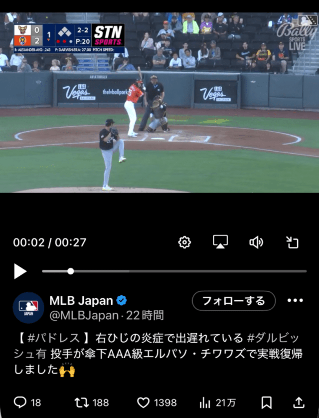 投稿された動画には、マイナーリーグ・ラスベガス戦で先発したダルビッシュが、鋭い直球と多彩な変化球を織り交ぜながら打者に立ち向かう姿が映し出されている。この試合では最速約156キロをマークし、初回に先制2ランを許したものの、2回以降は安定した投球を見せた。