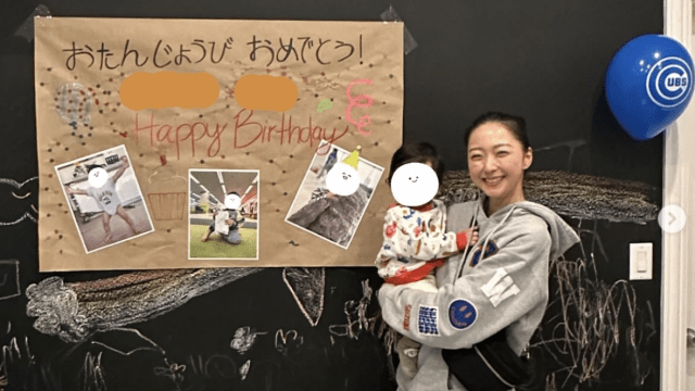 「カブスのチャイルドケアでも誕生日会を開いて頂きました」と投稿されたのは、畠山が次男を抱っこしてこちらを微笑む写真。壁には「おたんじょうびおめでとう」と誕生日を祝うペーパーが掲示されている。「チャイルドケアの方が日本語で『おたんじょうびおめでとう』と調べてかいてくださったそう! とても嬉しかったです」とコメント。