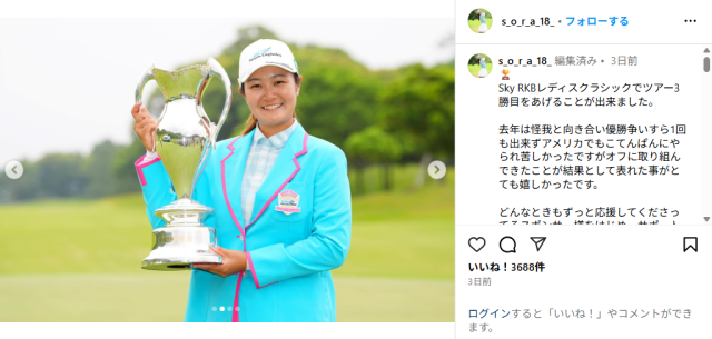 この投稿には、Instagramユーザーから「そらちゃん、優勝おめでとう」「逆転優勝おめでとうございます」「辛いシーズンを乗り越えての優勝、ゴルフ観戦に行って初めて泣いた」「感動のエンディングでした」「もらい泣きしました」「最後のイーグルパット!凄かったです」といったコメントが寄せられている。