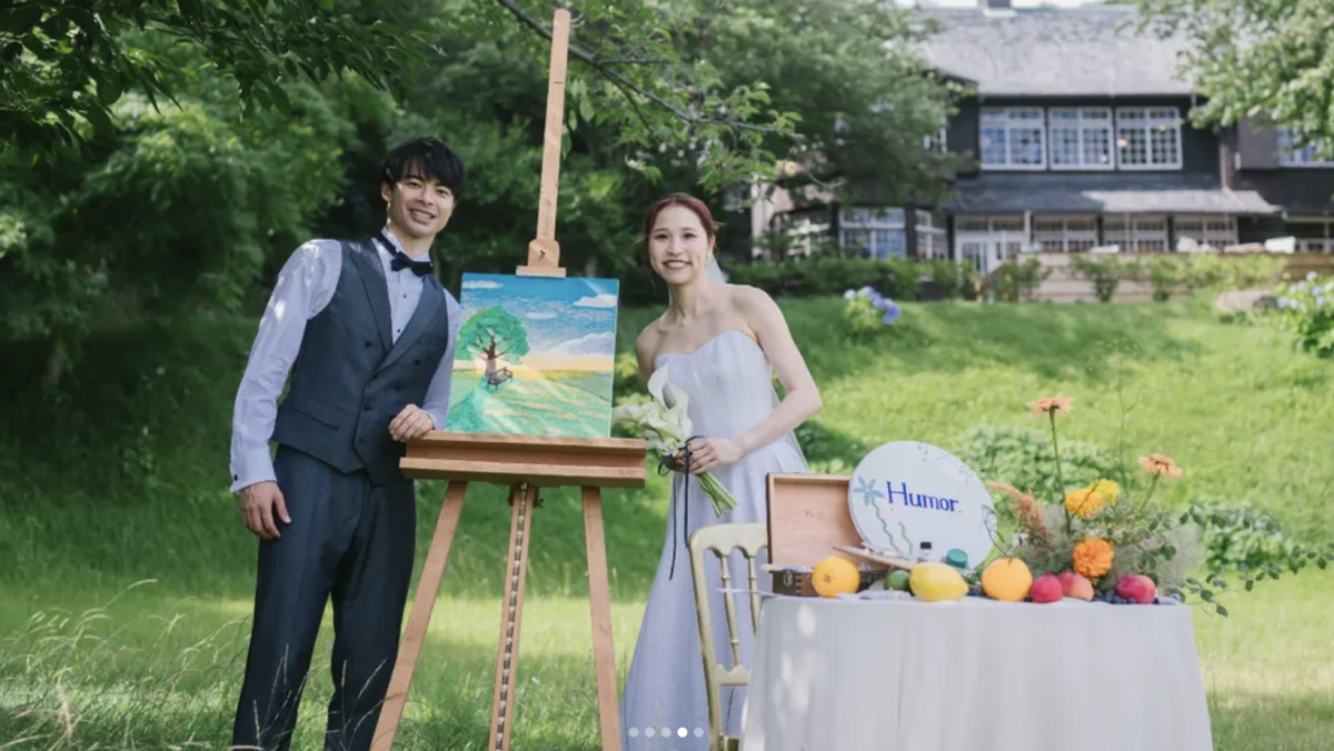 投稿では「Officially married in 2022. Celebrated in 2025.」とコメントを添え、青空の下で並んで微笑む2人の記念写真を掲載。新郎はベストスタイルのタキシード姿、新婦は肩出しのドレスにブーケを携えた華やかな装いで、絵画や果物が飾られたテーブルとともに笑顔を見せた。