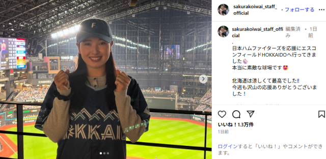 投稿された写真は、エスコンフィールドの球場内で笑顔を浮かべる小祝のソロショット。両手とも胸の前に掲げ、ガッツポーズをしている。応援スタイルは、日本ハムファイターズの限定ユニホームに、「F」のロゴ入りキャップを被るという気合の入れようだ。