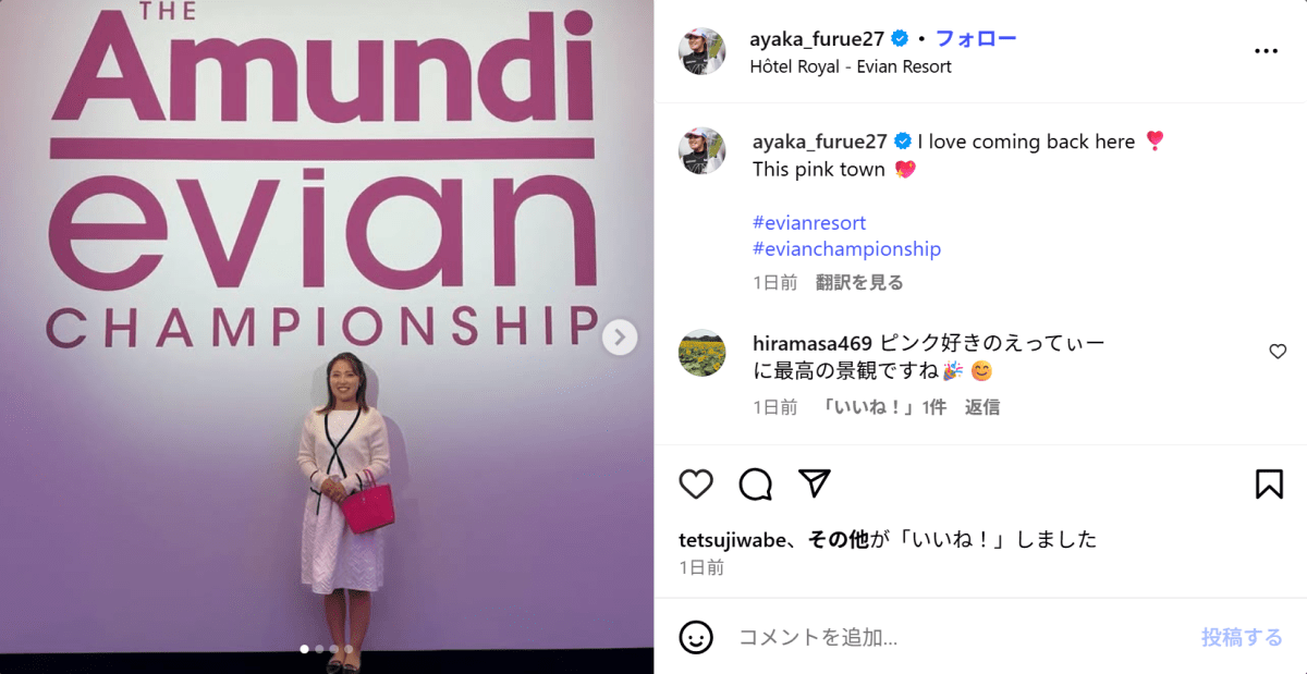 この投稿には、Instagramユーザーから「エビアンの差し色バッグ、さすが彩佳ちゃんオシャレです」「ワンピース とっても素敵です」といったコメントが。また、今大会では59位タイという結果に終わった古江に対し、「あの感動は一生忘れませんよ」「来年また刻みましょう」といった激励のコメントも集まっている。