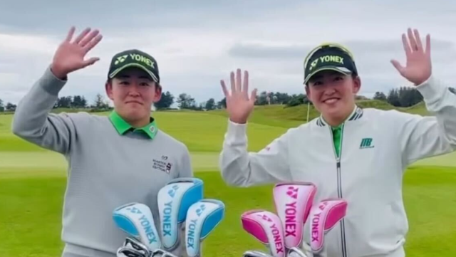 投稿された動画は、グリーン上の姉妹がそれぞれに「明愛ブルー」「千怜ピンク」と名付けられた鮮やかな色合いのキャディバッグについて紹介する様子を収めたもの。姉妹はやや照れた表情を浮かべつつ、ハキハキした説明をすると歯を見せつつ爽やかな笑顔で手を振った。