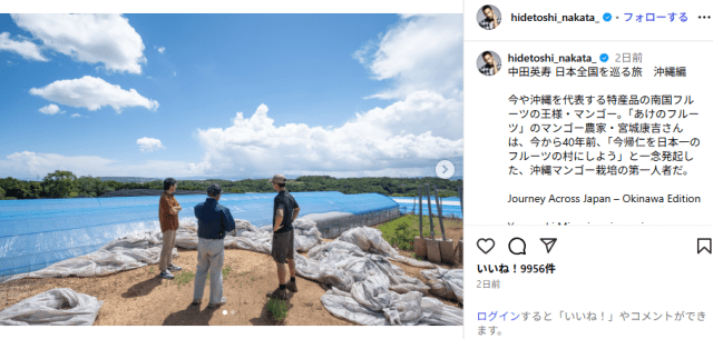 中田が、「中田英寿 日本全国を巡る旅 沖縄編」と題して投稿した写真は、大きな青空と緑の森の中にあるビニールハウスを見下ろす自身を含む3人男性のバックショットだ。中田はマンゴー農家を訪れたことを説明しており、腰に手を当てつつ農家と思われる男性の話に耳を傾けている。