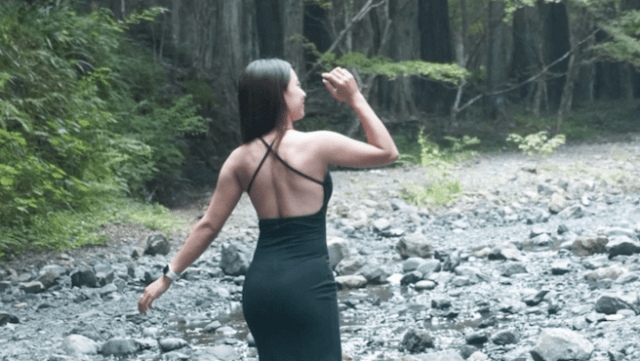 「写真集撮影第六弾 静岡の神社横の川で撮って来ました」いうコメントと共に投稿されたのは、大胆に背中が空いた深緑のワンピースを着た園田の写真。河原を裸足で歩き、引き締まった体を見せつけている。