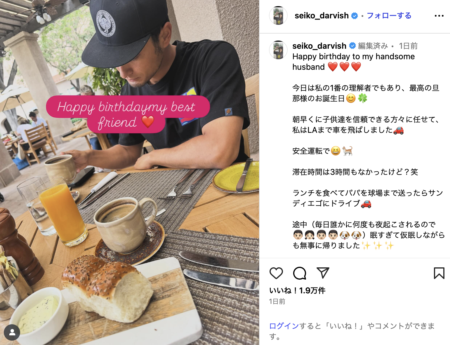 「1番の理解者でもあり、最高の旦那様」ダルビッシュ聖子、夫の誕生日に愛と祝福のメッセージ