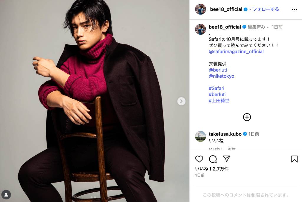 この投稿にはInstagramユーザーから「大人のかっこよさが詰まりすぎてます」「かっこよ過ぎて頭が追いついてません」「流石に軽くビビりましたw」「雰囲気が違うのめっちゃかっこいい」といったコメントが寄せられた。