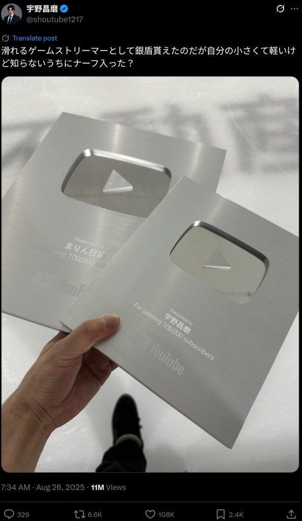 「滑れるゲームストリーマーとして銀盾貰えた」と宇野が投稿したのは、2枚の「銀の盾」の写真だ。この「銀の盾」は、YouTubeのチャンネル登録者数が10万人を超えたクリエイターに贈られるもの。2つの「銀の盾」のうち、1つは宇野の名前、もう1つは交際中の本田真凜(24)のチャンネル名が刻まれている。2つは同じ「銀の盾」ではあるものの、よく見ると宇野の物は一回り小さく、本田のものとはサイズが異なることが分かる。これについて宇野は「自分の小さくて軽いけど知らないうちにナーフ入った?」とコメントしており、戸惑っているよう。
