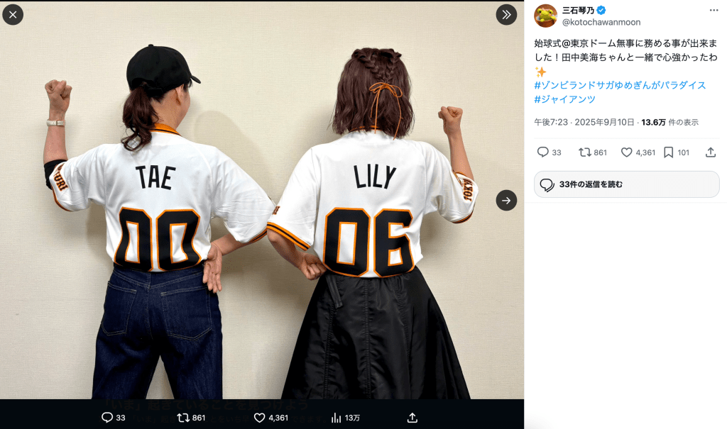 投稿されたのは、ジャイアンツのユニフォームを着用した、三石と田中の後ろ姿の写真。10日の株式会社Cygames提供の「劇場版ゾンビランドサガ ゆめぎんがパラダイスナイター@東京ドーム」として、同作キャラクターの声優を務める三石と田中が始球式を務めた。