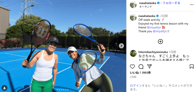練習風景をおさめた動画も投稿した畑岡は、英語で初めてのテニスレッスンであることを明かしつつ、共にレッスンを受けたタバタナキットへ「Thank you」と感謝の意を述べた。