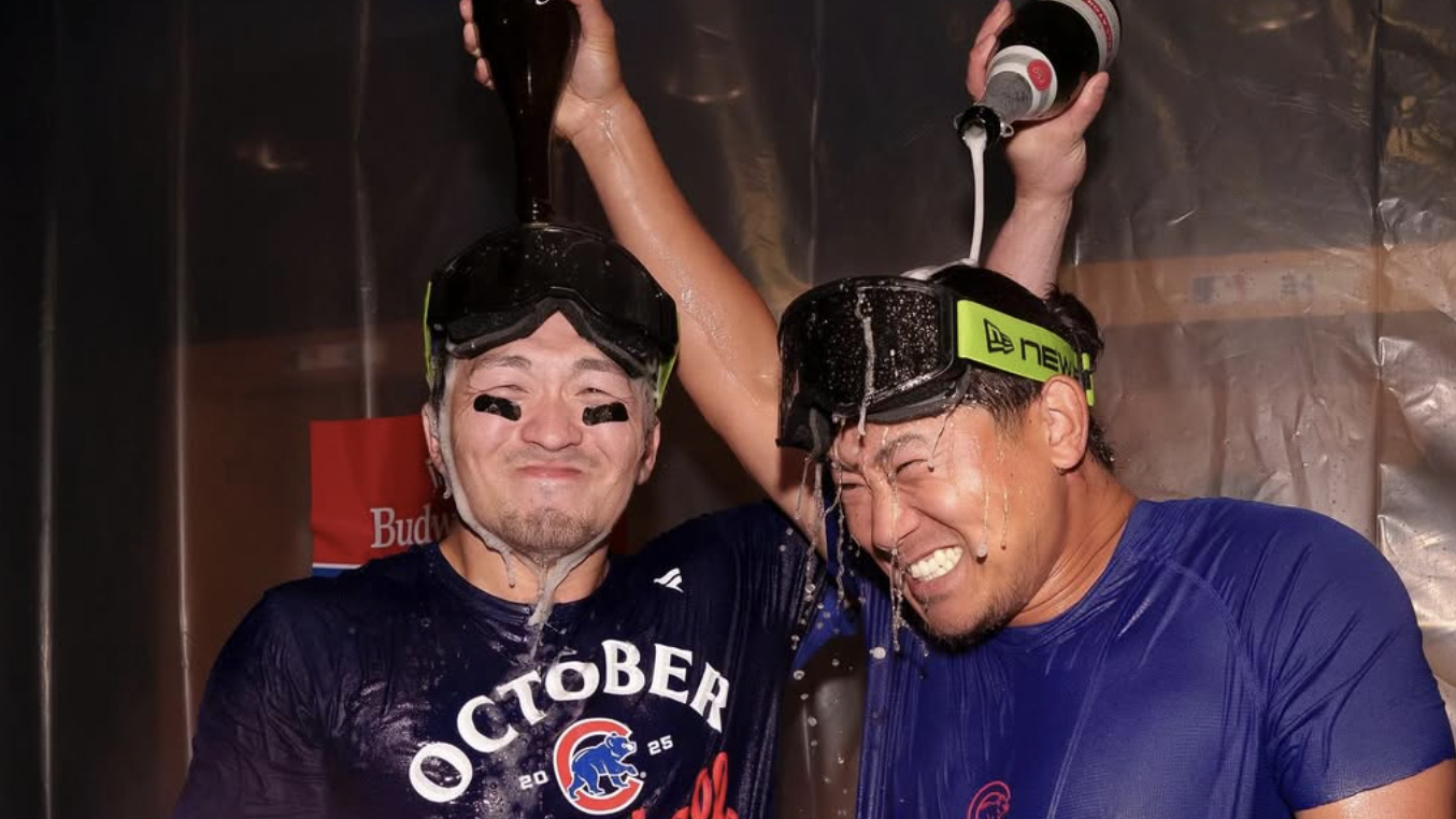 今永昇太&鈴木誠也、輝く笑顔のシャンパンファイトにSNS歓喜「弾けすぎてる」「この2ショット見たかった」