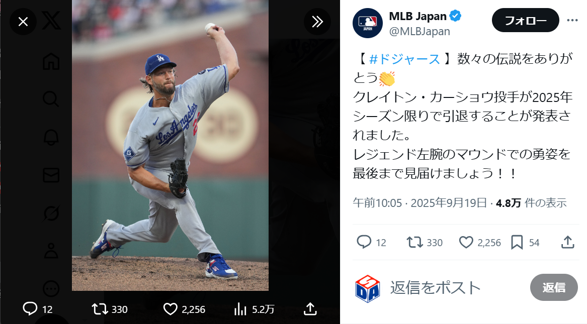 ドジャースの“レジェンド左腕”カーショーが引退表明 「寂しいね」「リスペクトです!」日本のファンからも惜別の声