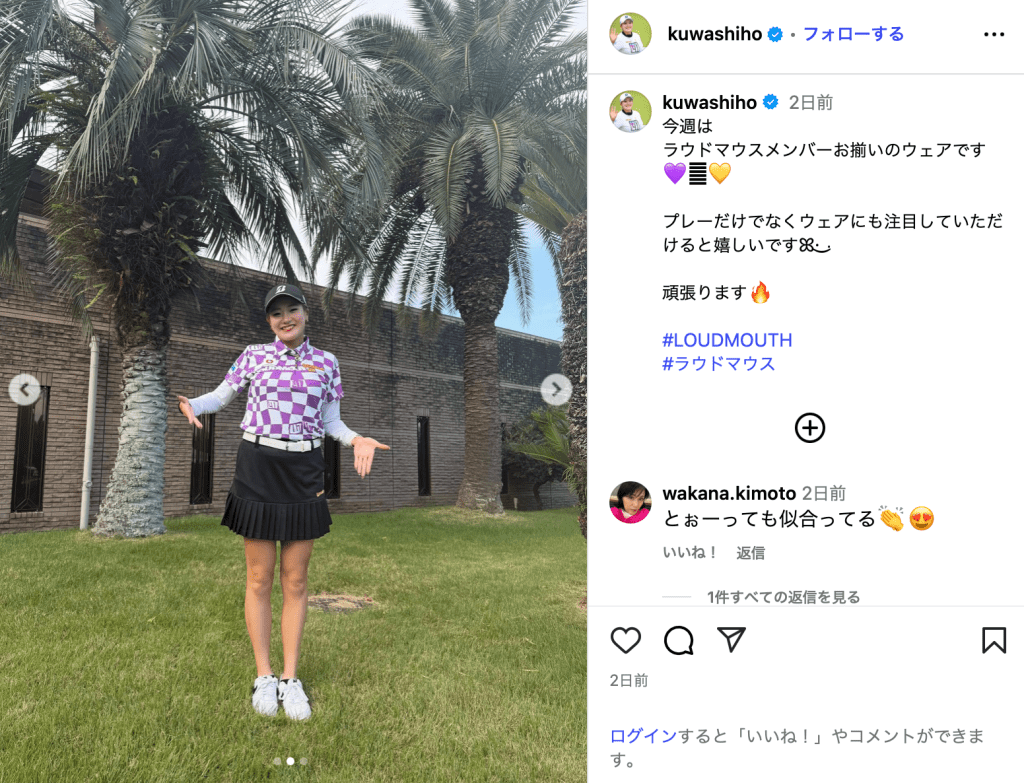 「今週はラウドマウスメンバーお揃いのウェアです」と投稿されたのは、ゴルフウェアブランド「ラウドマウス」のウェアを着用した桑木の写真。パープルチェックのトップスに、膝上丈の黒いミニスカートを着用しほほ笑んでいる。桑木は「プレーだけでなくウェアにも注目していただけると嬉しいです 頑張ります」とアビールした。