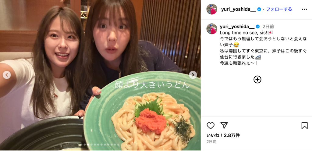 「Long time no see, sis! 今ではもう無理して会おうとしないと会えない妹子」と投稿されたのは、優利と鈴が一緒に食事を楽しんでいる様子。「顔より大きいうどん」「一玉を頼んだつもりが2人とも二玉分でした、、」と表情豊かな写真が投稿されている。
