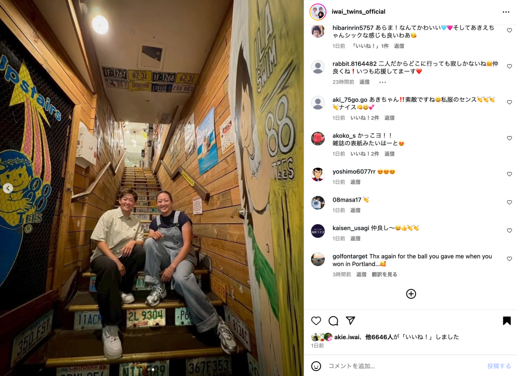 女子ゴルフの岩井明愛(23)と岩井千怜(23)のスタッフ公式Instagramが10月1日、ハワイでのオフショットを公開。ワイキキの人気店「88Tees」の木目調の店内で、階段に並んで座るツーショットが投稿され、「Hawaii Days」を楽しむ様子が届けられた。