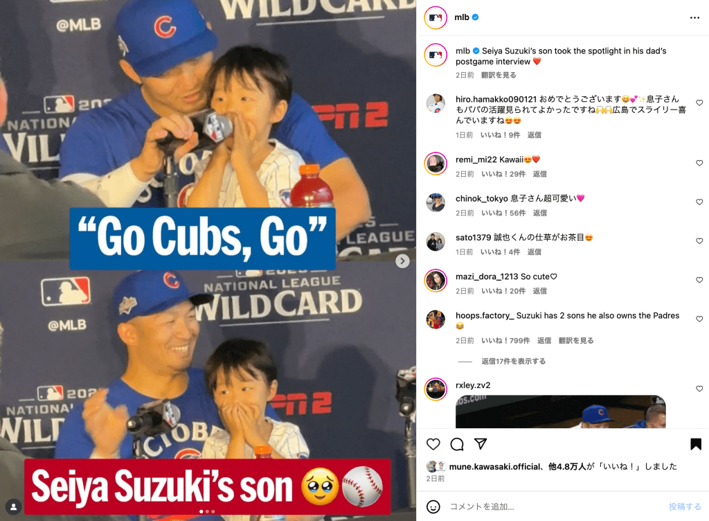 シカゴ・カブスの鈴木誠也(31)が10月1日、ワイルドカードシリーズ第1戦後の会見に登場。試合後のインタビューでは、長男の大翔(ひろと)くんが父のひざの上に座りマイクを握る姿が公開され、球団公式SNSやMLB公式アカウントを通じてファンの注目を集めた。