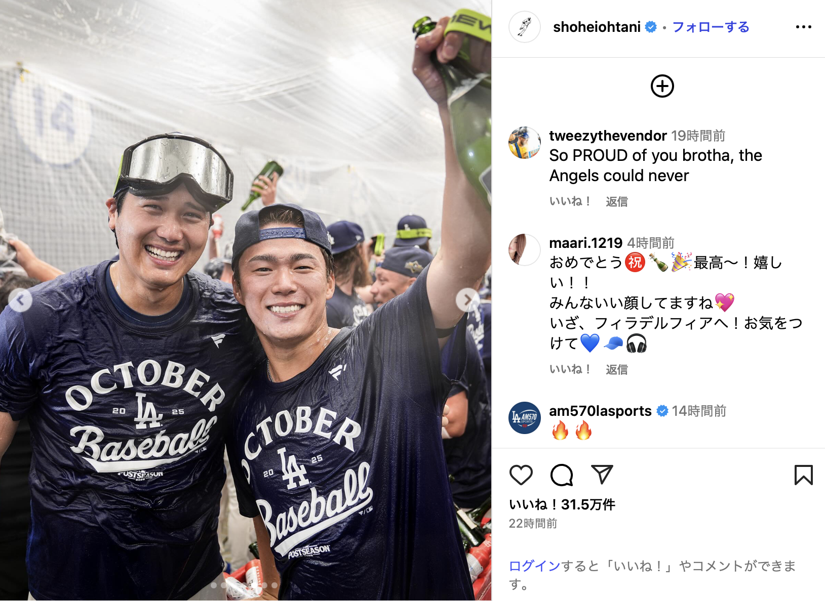 大谷翔平&山本由伸、シャンパンファイトで笑顔の2ショット 「みんないい顔してますね」「2人の笑顔大好き」