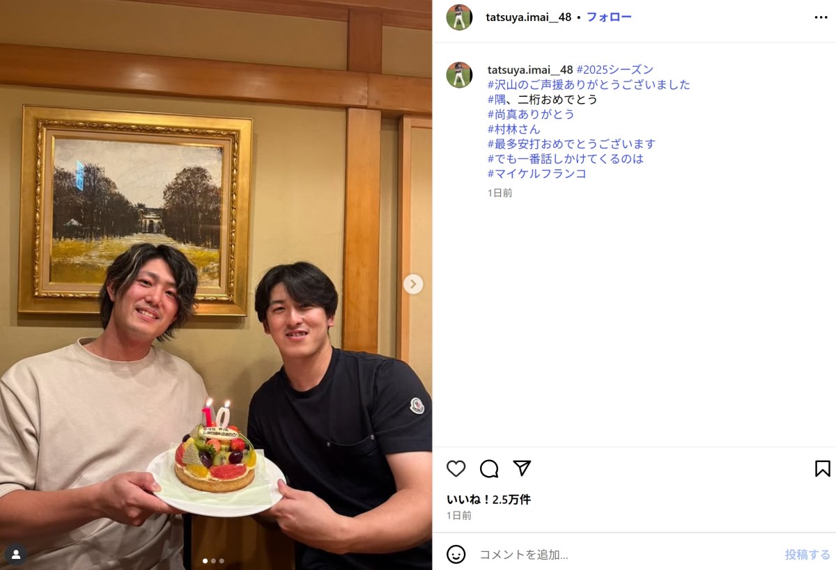 今井は「2025シーズン」「たくさんのご声援ありがとうございました」とのコメントとともに、隅田知一郎(26)とケーキを持った写真を公開。ケーキには「#48 #16 二桁勝利おめでとう!」と、2人の背番号とともにメッセージが書かれていた。