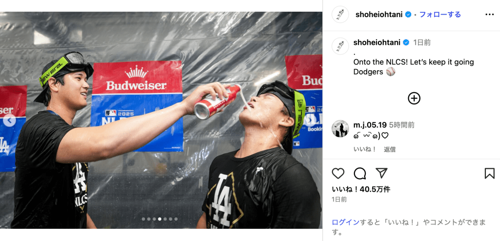 投稿されたのは、チーム全員の集合写真やシャンパンファイトの写真。大谷が山本由伸(27)にビールを飲ませて子供っぽく笑う写真も投稿された。山本はビールを口に含み苦しそうな表情を浮かべている。大谷は「Onto the NLCS! Let’s keep it going Dodgers」と英文で勝利を祝った。