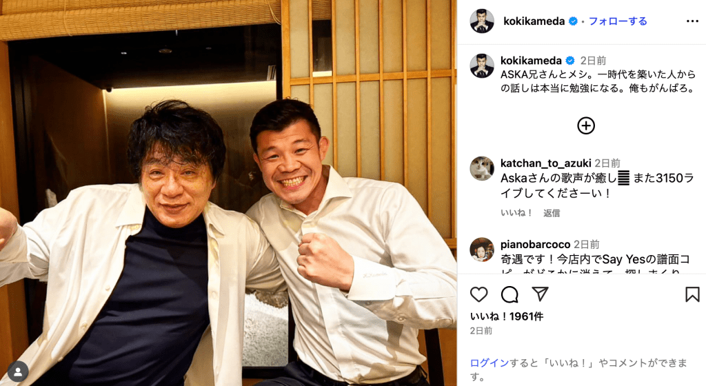 「ASKA兄さんとメシ」と投稿されたのは、飲食店の扉の前で撮影されたASKAと亀田のツーショット。ASKAはシャツの前を開けてほろ酔いの表情を浮かべ、亀田は白シャツとフォーマルな佇まいで満面の笑みを見せた。亀田は「一時代を築いた人からの話しは本当に勉強になる。俺もがんばろ」としみじみとしたコメントで締めくくった。