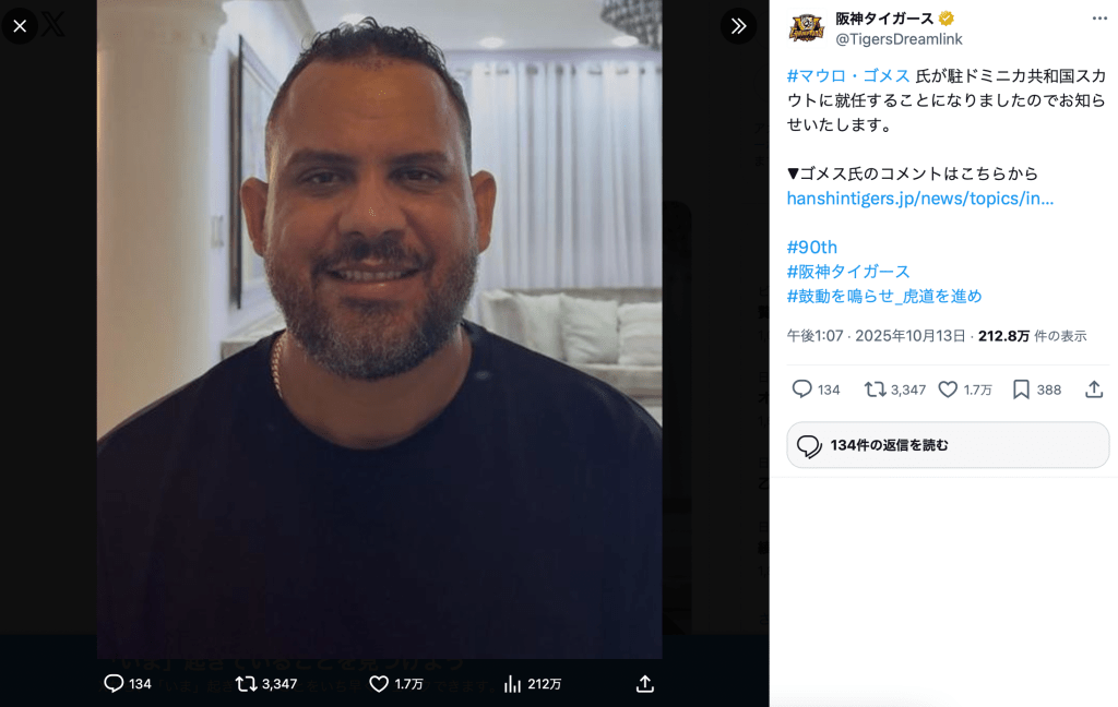 阪神タイガースが10月13日、Xを更新。マウロ・ゴメス(41)が駐ドミニカ共和国スカウトに就任することを発表した。