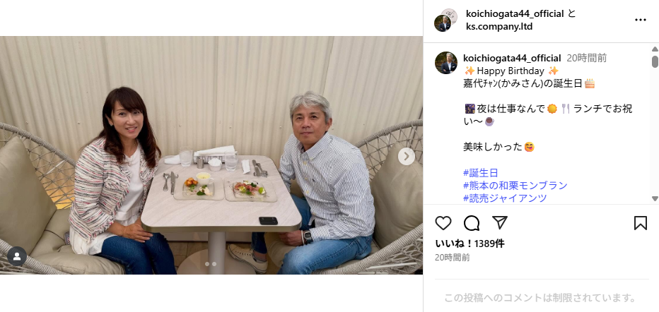 元プロ野球選手で野球解説者の緒方耕一(57)が10月14日、Instagramを更新。妻の誕生日をお祝いした際のオフショットを公開した。