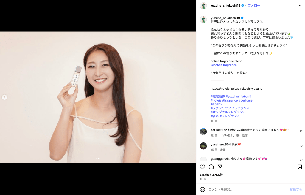 日テレ・東京ベレーザのMF塩越柚歩(27)が10月15日、自身のInstagramを更新。フレグランスブランド「NOTEIA(ノティア)」とのコラボ投稿を行い、「この香りがあなたの笑顔をそっと引き出せますように」とメッセージを添えて写真を公開した。