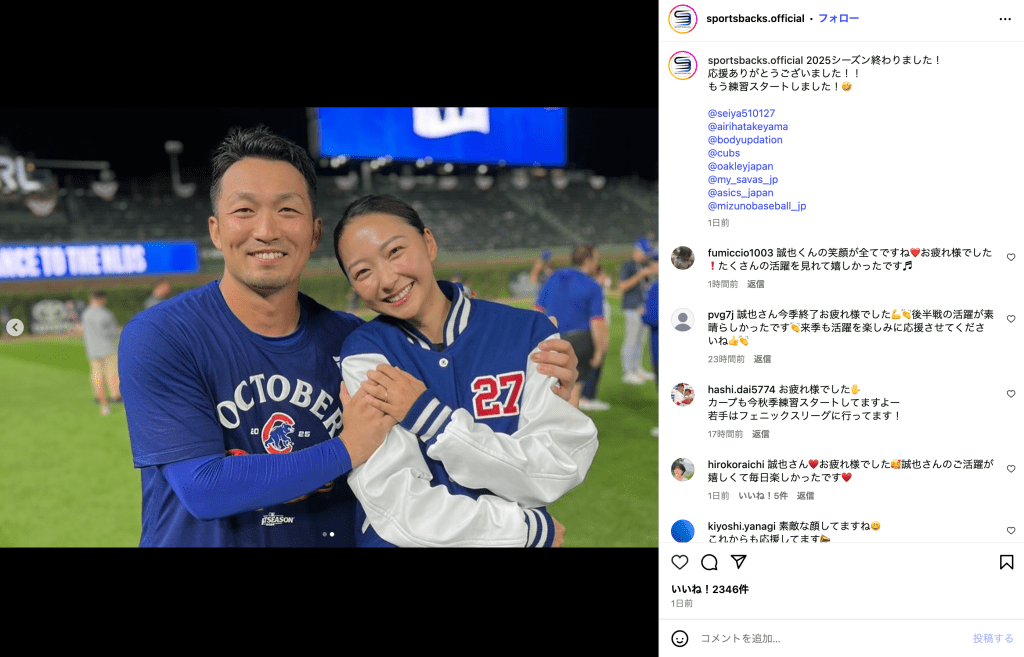 この投稿には、Instagramユーザーから「誠也くんの笑顔が全てですね お疲れ様でした」「素敵な顔してますね これからも応援してます」「ファンとして感謝です ありがとう」「誠也さん今季終了お疲れ様でした」と、夫婦そろっての笑顔ショットに、ファンから祝福と感謝のコメントが相次いでいる。