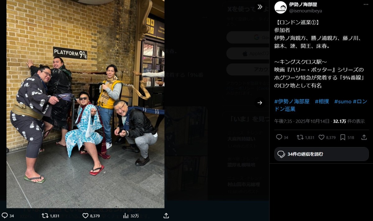 伊勢ノ海親方と力士らがイギリスの「聖地」で“ハリポタごっこ” SNS反響「みんなのマフラーなんなのww」
