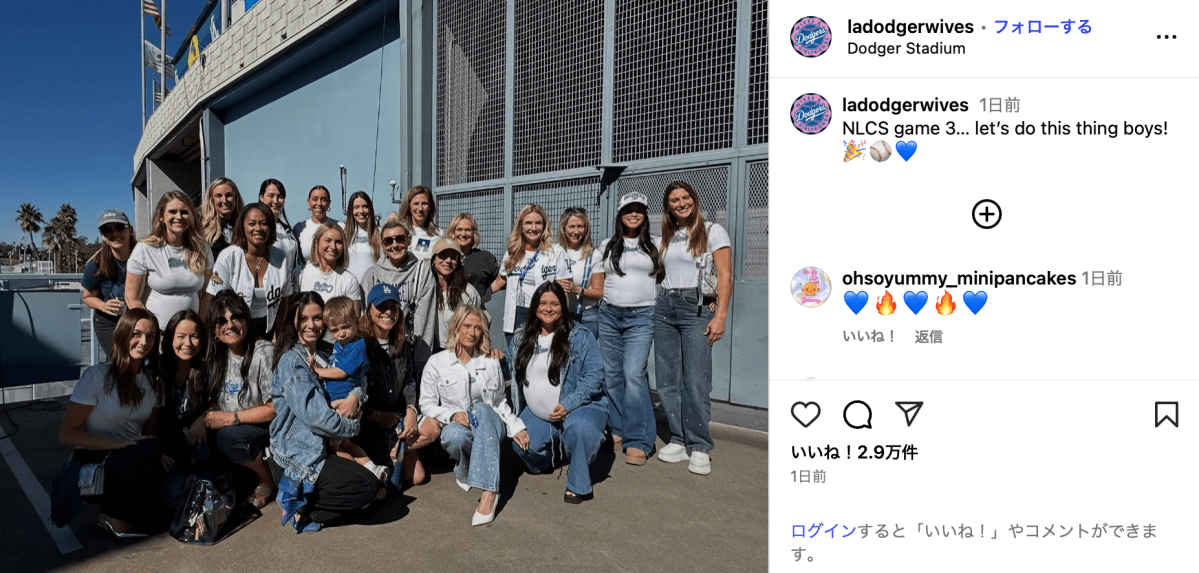 投稿されたのは、ドジャース選手の妻らが集まった集合写真。真美子夫人は中央左側後方に立ち、白のTシャツ姿で笑顔を浮かべている。ブルワーズとのナ・リーグ優勝決定シリーズ第3戦に駆けつけたものと思われる。