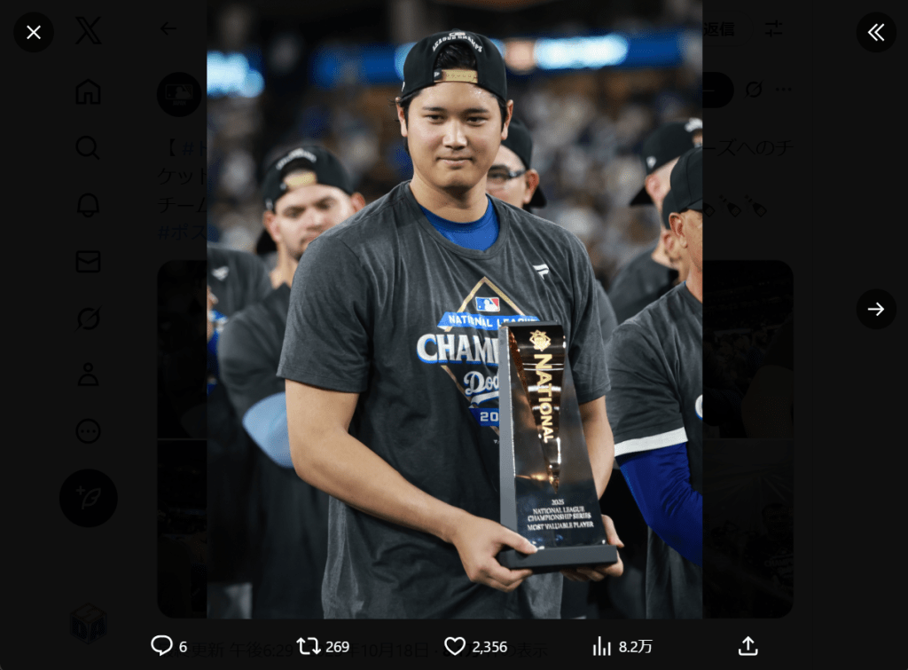 MLB Japanは10月19日、公式X(旧Twitter)を更新。同日、ロサンゼルス・ドジャースがナ・リーグ優勝決定シリーズ(NLCS)を制し、ワールドシリーズ進出を決めたことを、大谷翔平(31)らの写真と共に祝福した。
