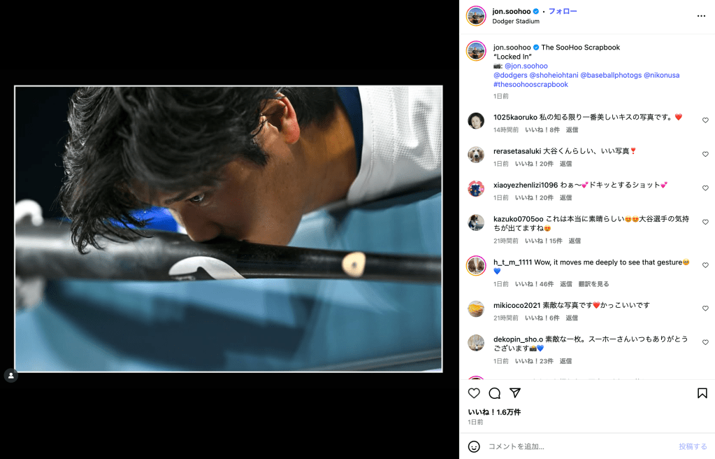 写真には、試合前の静けさの中で目を閉じ、愛用のバットにそっとキスをする大谷の姿が収められている。柔らかな光が頬を照らし、真剣な眼差しの奥に漂う祈りと覚悟が印象的だ。まるで映画のワンシーンのような美しさに、国内外のファンから称賛が相次いでいる。