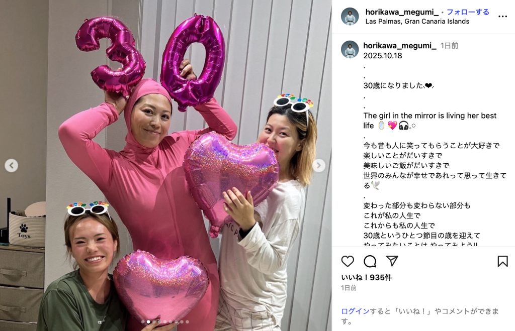 「2025.10.18 ..30歳になりました」と投稿されたのは、ピンクの全身タイツに身を包んだ堀川の写真。両手で「30」のバルーンを手に持ち、おどけた表情を見せている。
