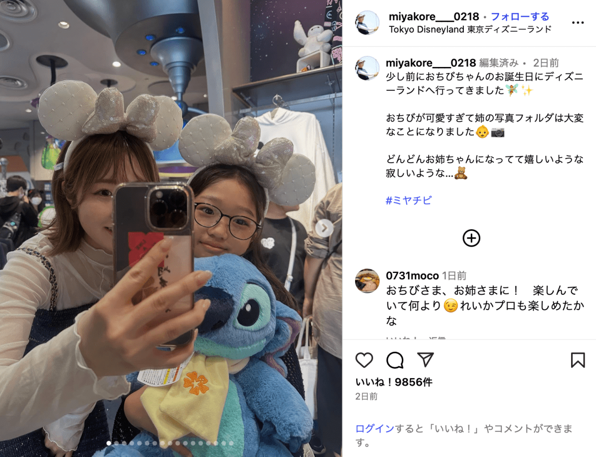 「少し前におちびちゃんのお誕生日にディズニーランドへ行ってきました」と投稿されたのは、都が妹とディズニーランドに出かけたときの写真。お揃いのカチューシャを付ける様子や、手をつないで歩く動画などが投稿され、ディズニーランドを満喫した様子だった。