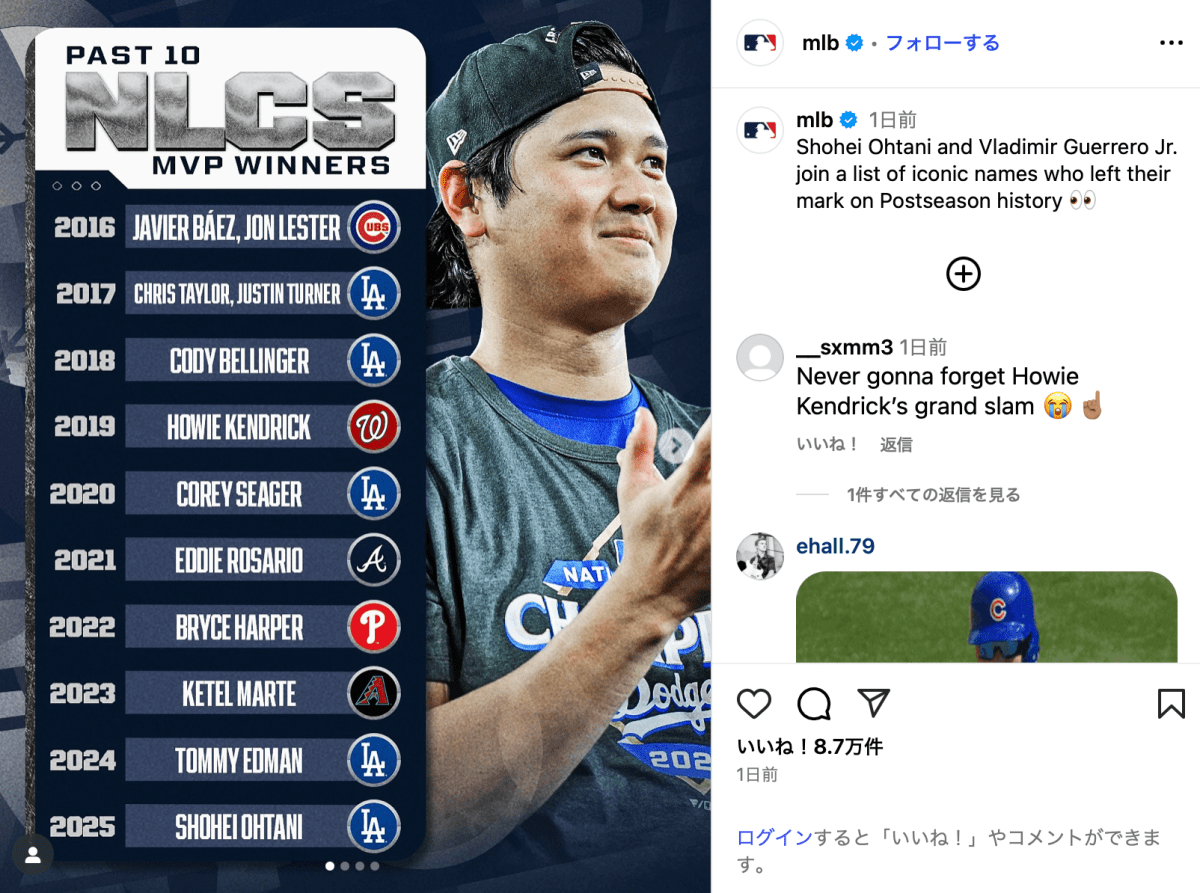 投稿されたのは、ナショナル・リーグ優勝決定シリーズ(NLCS)、アメリカン・リーグ優勝決定シリーズ(ALCS)それぞれのMVPの年表。NLCSの2025年度MVPは大谷が選出され、ALCSからはブラディミール・ゲレーロ・ジュニア(26)が選出された。ドジャースからのMVP選出は過去10年間で5度目。
