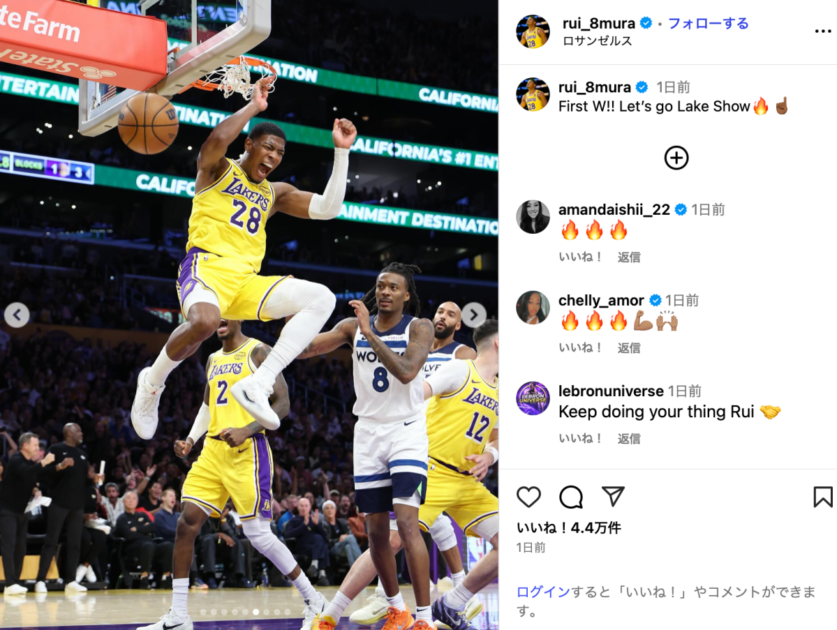 「First W!! Let’s go Lake Show」と投稿されたのは、八村がレイカーズのユニフォームを着て真剣な表情を見せる写真。その他、チームメイトと談笑する様子やダンクシュートを決める様子など試合中の様子が投稿されている。24日に八村はティンバーウルブズ戦に先発。31分51秒間のプレーで23得点をマークし、チームの今季初勝利に貢献した。