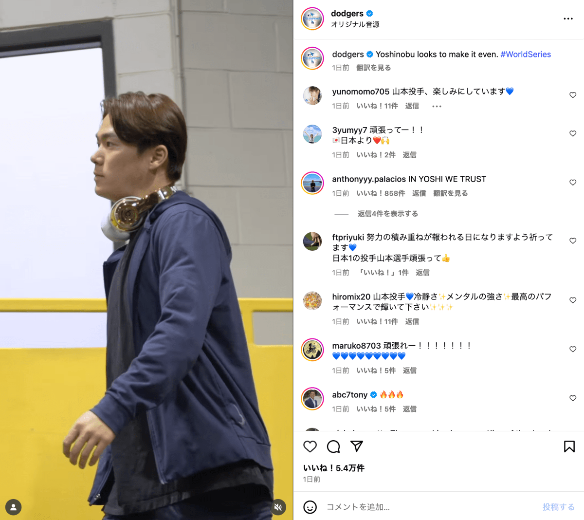 投稿には、紺のセットアップに白のスニーカーというラフなスタイルで歩く山本の姿が映し出されている。首にはYOSHINOBUのロゴ入りヘッドホンをかけ、落ち着いた面持ちで通路を進む姿が印象的だ。動画では山本が「ストライクゾーンでどんどん投げていくというのはいつも通り心掛けていくので」と語り、集中力と冷静さがにじむ映像となっている。