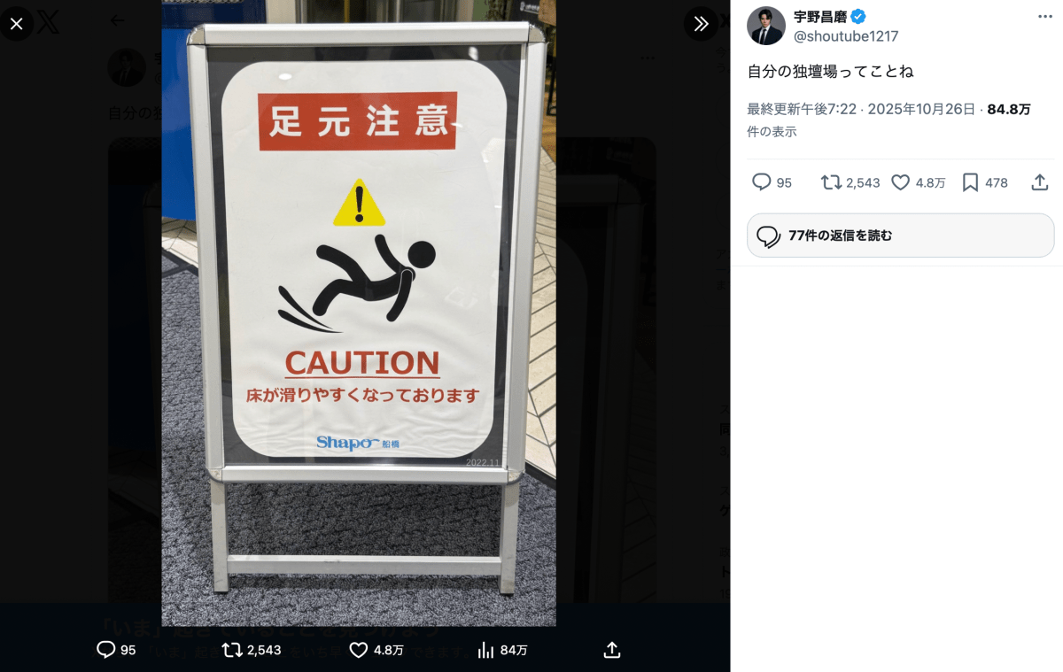 「自分の独壇場ってことね」と投稿されたのは、「床が滑りやすくなっております」と足元注意を呼びかける看板。フィギュアスケート選手として、滑ることに関しては“独擅場”というニュアンスを込めたようだ。宇野が訪れたのは船橋駅直結のショッピングセンター「シャポー船橋」。