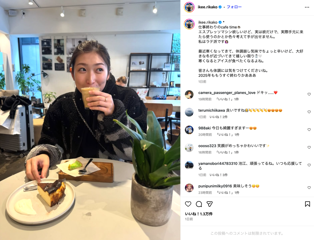 池江は「仕事終わりのcafe time」と題し、バスクチーズケーキを前にカフェラテを手にした1枚を投稿。黒のボアジャケット姿で頬杖をつき、カメラの横を見ながら微笑む自然体の表情が印象的だ。「最近寒くなってきて、体調崩し気味でちょっと辛いけど、大好きな冬が近づいてきて嬉しい限り」とつづりつつ、「皆さんも体調には気をつけてくださいね」と呼びかけた。
