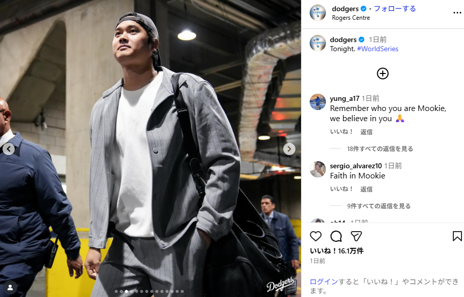 この投稿には、ネットユーザーから「Shoheiのお洋服凄く素敵」「ドジャース内でセットアップ流行ってる」といったファッションに注目するコメントが寄せられた。また、「崖っぷちでも戦うことを楽しみにしてる大谷翔平投手 これよこれ」「さぁ行こう!」「Let’s Go Dodgers」といった勝利を期待するコメントが寄せられている。
