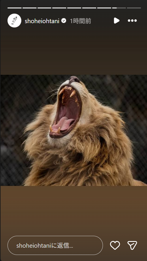 投稿されたのは、大きな口を開けた大人のライオンの写真。その前の投稿では山本が雄叫びを上げる写真を投稿しており、山本とライオンを重ねてイジったと思われる。大谷は以前も山本をライオンになぞらえてイジるストーリーズを投稿しているが、ネットで注目を集めているのは、過去の画像は子どもライオンだったことに対し、今回の画像は大人のライオンだったという変化だ。山本はワールドシリーズでシリーズMVPを受賞する活躍を見せており、大谷も山本の成長を認めたようだった。
