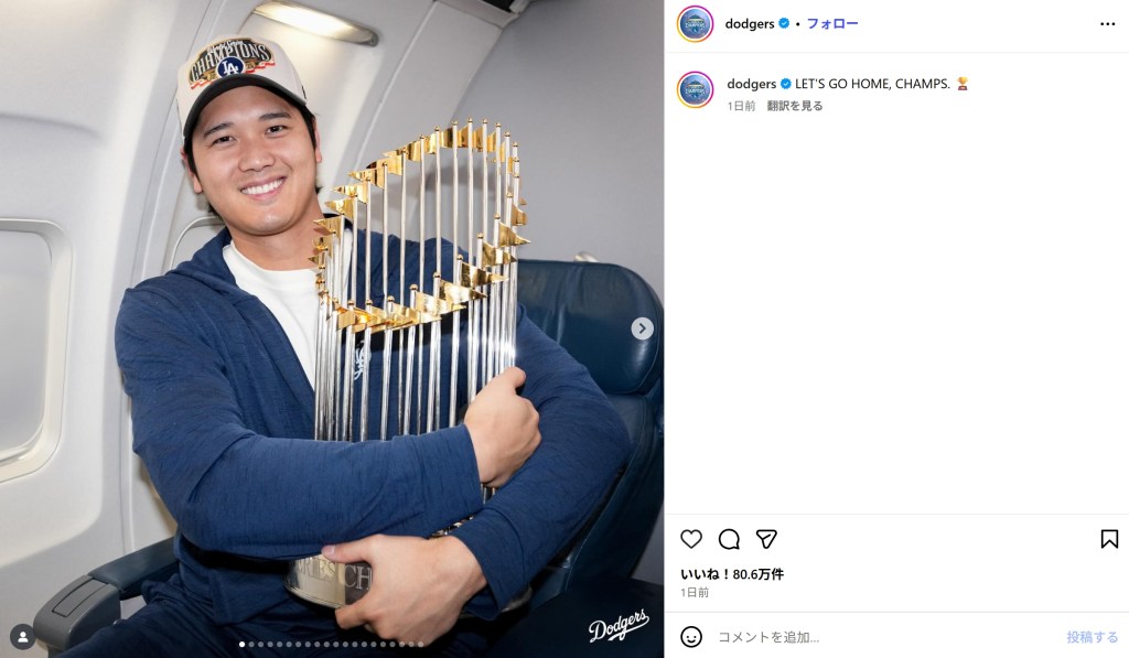 ドジャースはブルージェイズとのワールドシリーズ第7戦を制し、球団史上初となる2年連続優勝を達成。「LET’S GO HOME, CHAMPS」と題された投稿ではロサンゼルスへの凱旋の途上、機内で撮影された選手たちの写真を紹介した。
