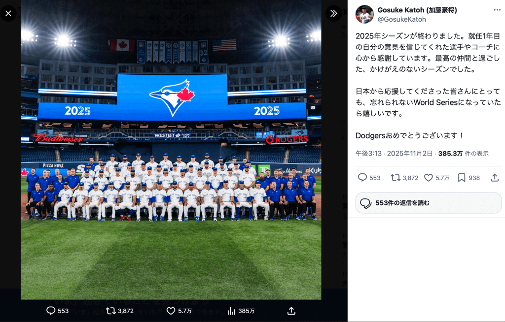「2025年シーズンが終わりました」と投稿されたのは、ブルージェイズメンバーの集合写真。加藤はユニフォームを着てグラウンドに立ち、選手の練習のサポートを担当していた。加藤は「就任1年目の自分の意見を信じてくれた選手やコーチに心から感謝しています。最高の仲間と過ごした、かけがえのないシーズンでした」と続け、「日本から応援してくださった皆さんにとっても、忘れられないWorld Seriesになっていたら嬉しいです。Dodgersおめでとうございます!」と締めくくった。