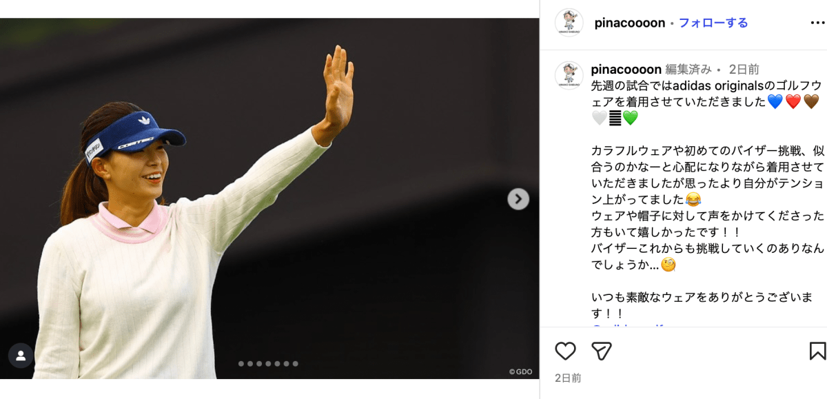 「先週の試合ではadidas originalsのゴルフウェアを着用させていただきました」と投稿されたのは、渋野がadidasマークがついたウェアを着用してほほ笑む写真。サンバイザーやトップス、スニーカーまでadidasづくしとなった。